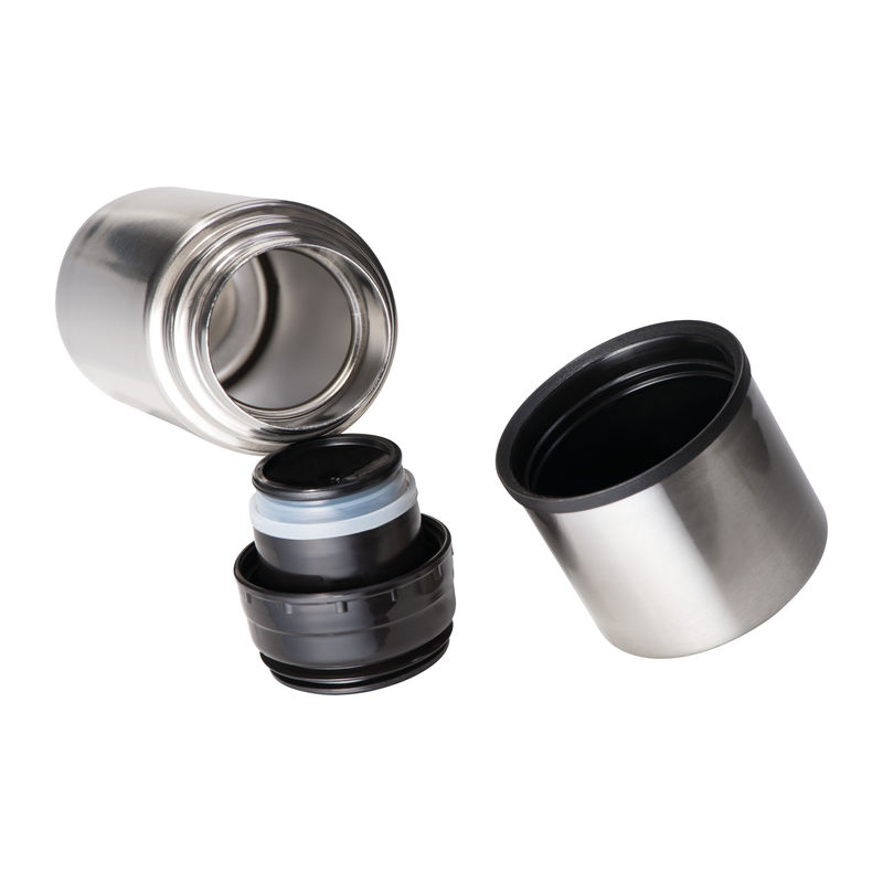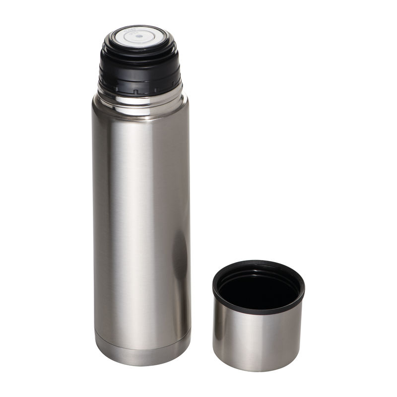 Leak-proof, double-walled stainless steel vacuum insulated thermos bottle featuring an integrated cup within the lid. Capacity: 500 ml.