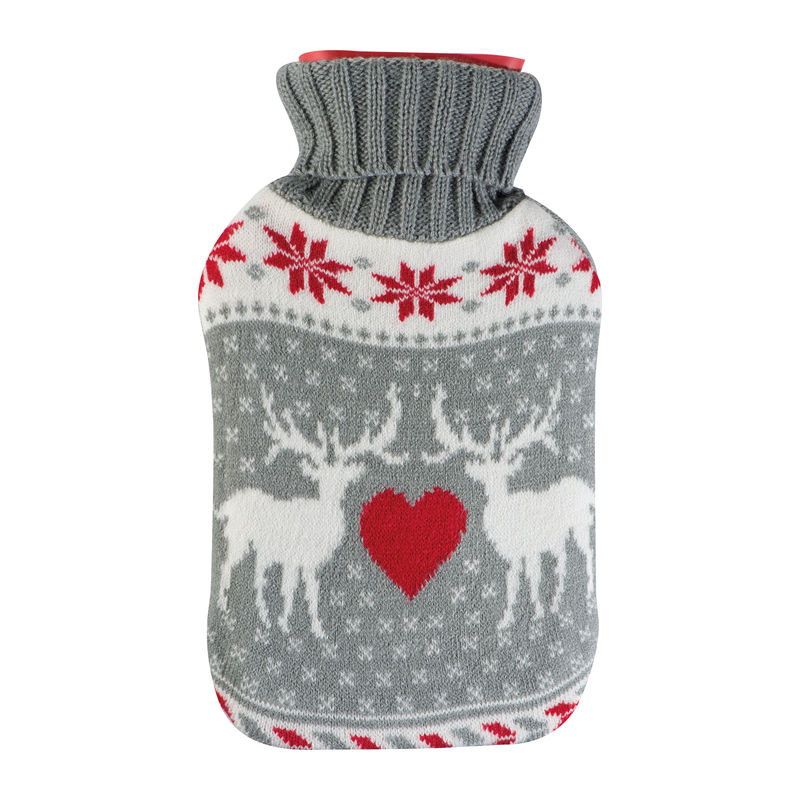 Rubber hot water bottle with a wool-knitted Christmas cover/sleeve. Filling capacity 500 ml.