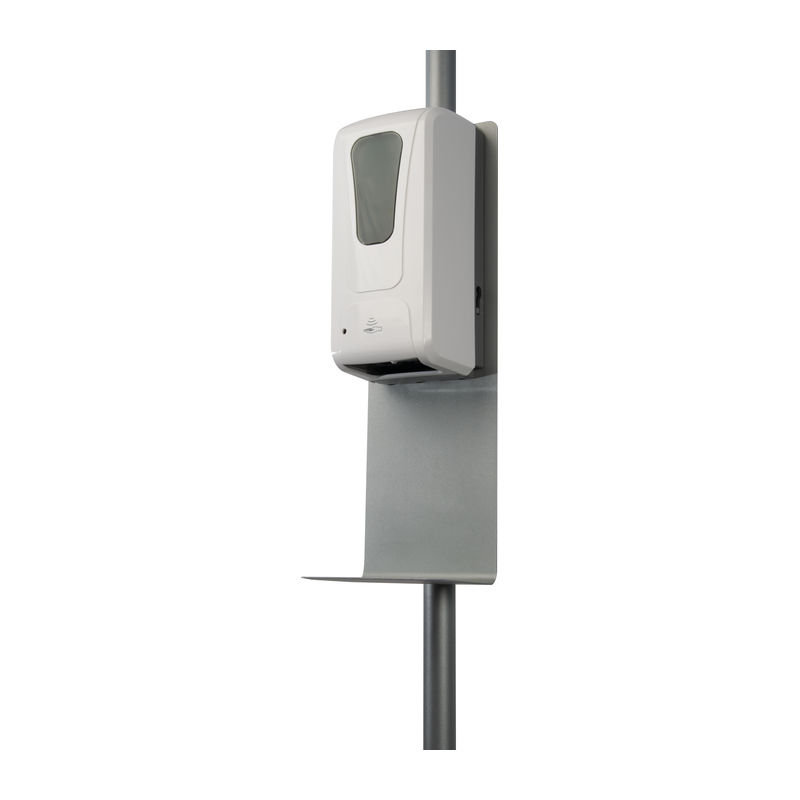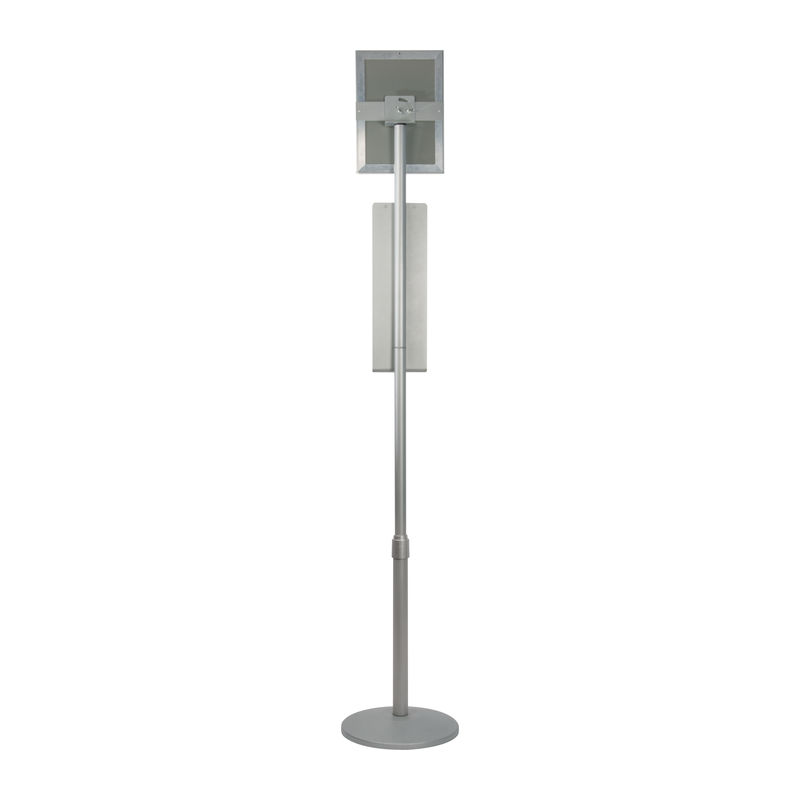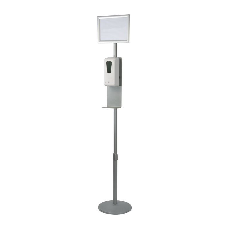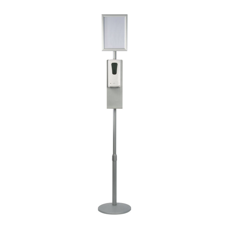 Desinfectiezuil met een stabiele voet, een telescoopstang (125-165 cm), een A4-formaat advertentieruimte en een container met een inhoud van 1000 ml voor desinfecterende gel of vloeistof, batterijen zijn niet inbegrepen. Ideaal voor autoriteiten, restaurants, winkels of bedrijven. U kunt uw reclameboodschap zelf op A4 printen en op elk moment personaliseren.