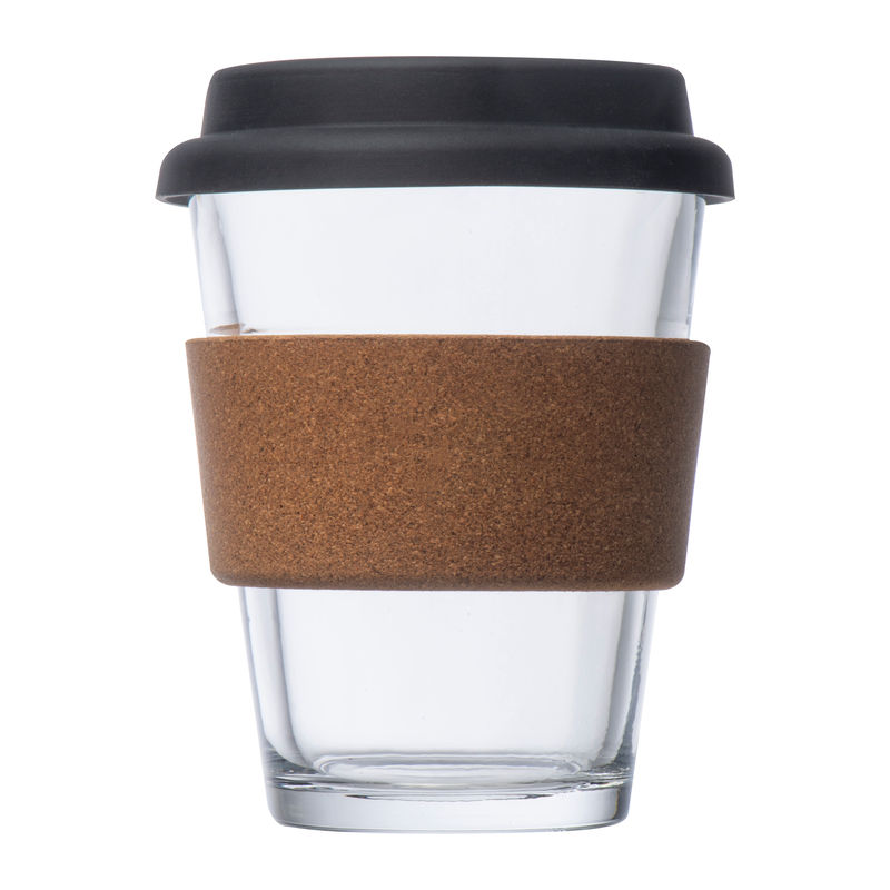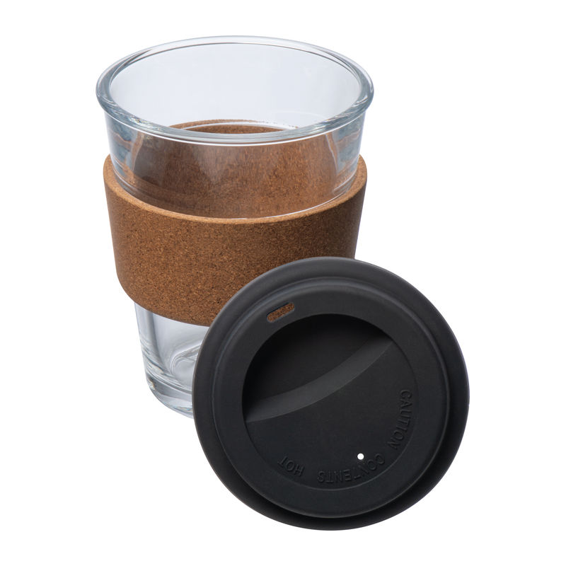Glazen drinkbeker met siliconen deksel en kurken hoes en een inhoud van 350ml. Uw reclame wordt met een laser op de manchet gegraveerd. Door de natuurlijke structuur van het kurkmateriaal is elk item en elke gravure uniek.