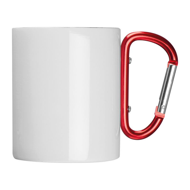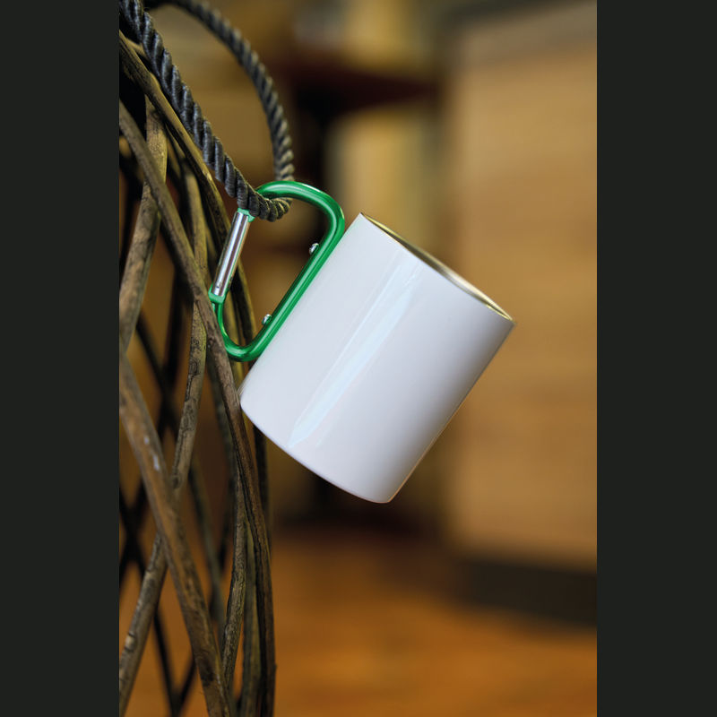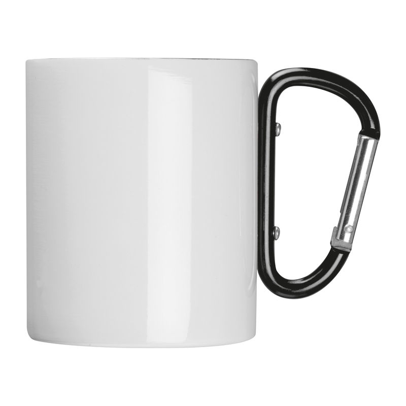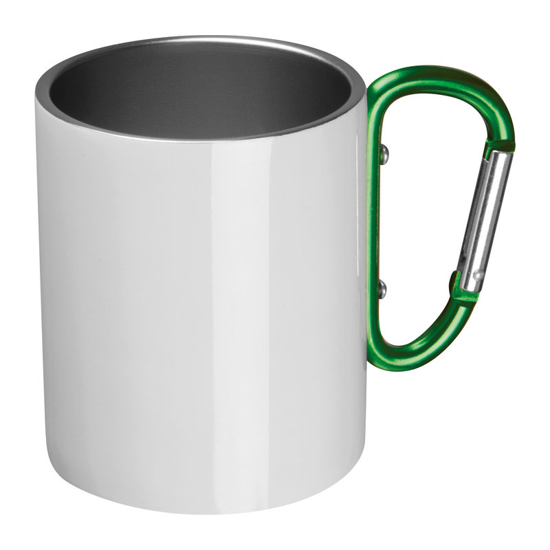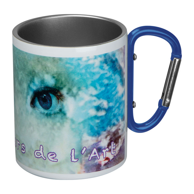 Gobelet en acier inoxydable avec mousqueton en aluminium de couleur et d'une contenance de 300 ml. Votre publicité est imprimée par sublimation sur tout le pourtour du gobelet.