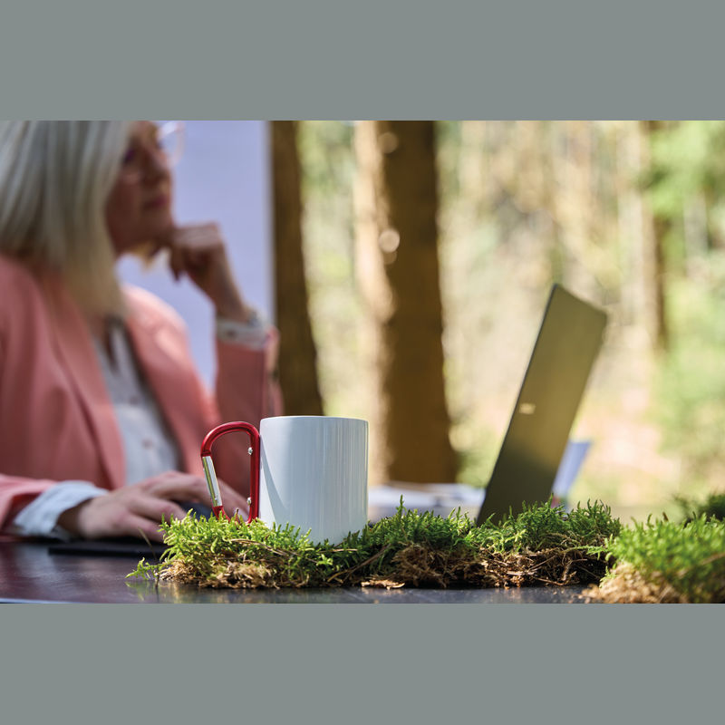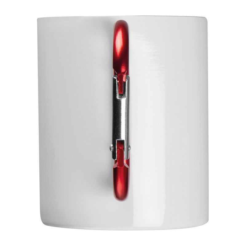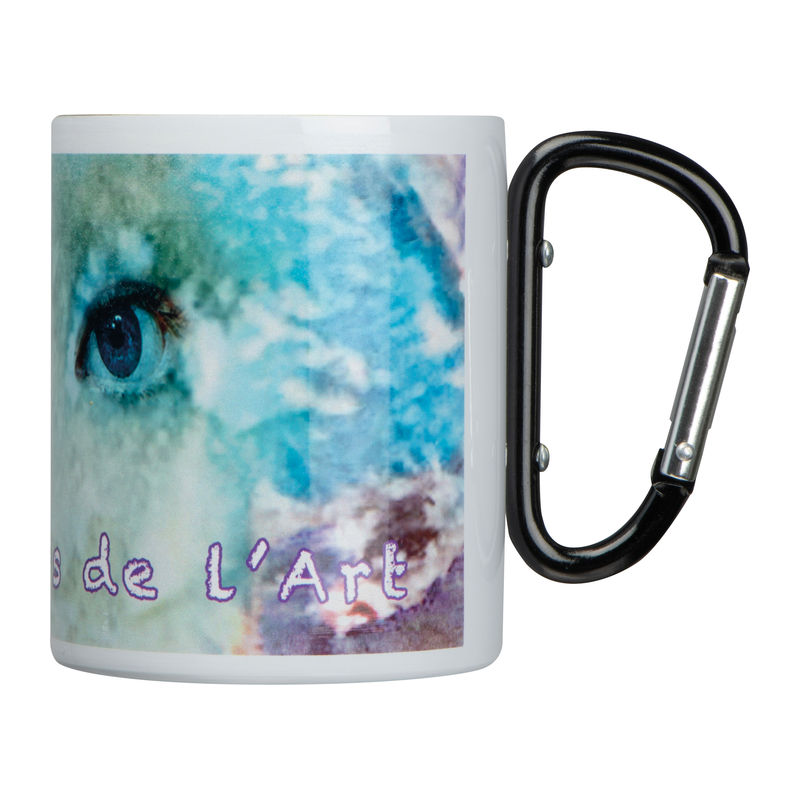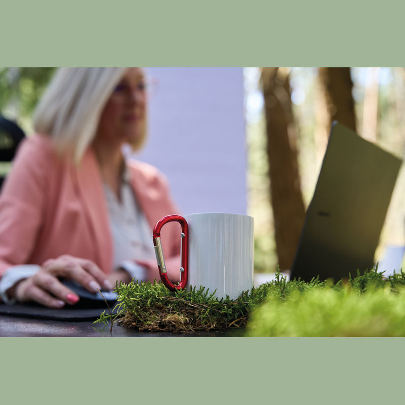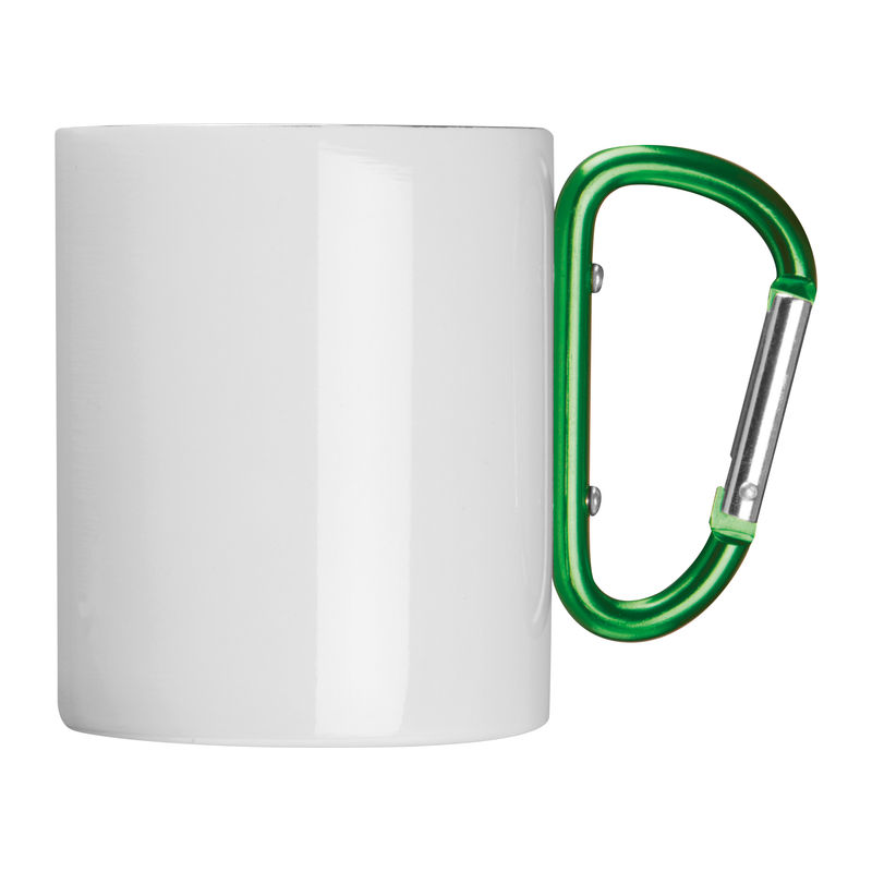 Gobelet en acier inoxydable avec mousqueton en aluminium de couleur et d'une contenance de 300 ml. Votre publicité est imprimée par sublimation sur tout le pourtour du gobelet.