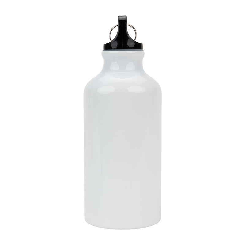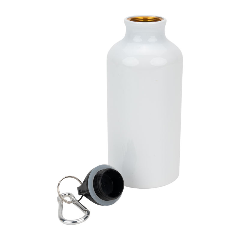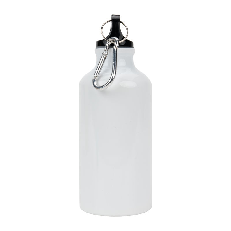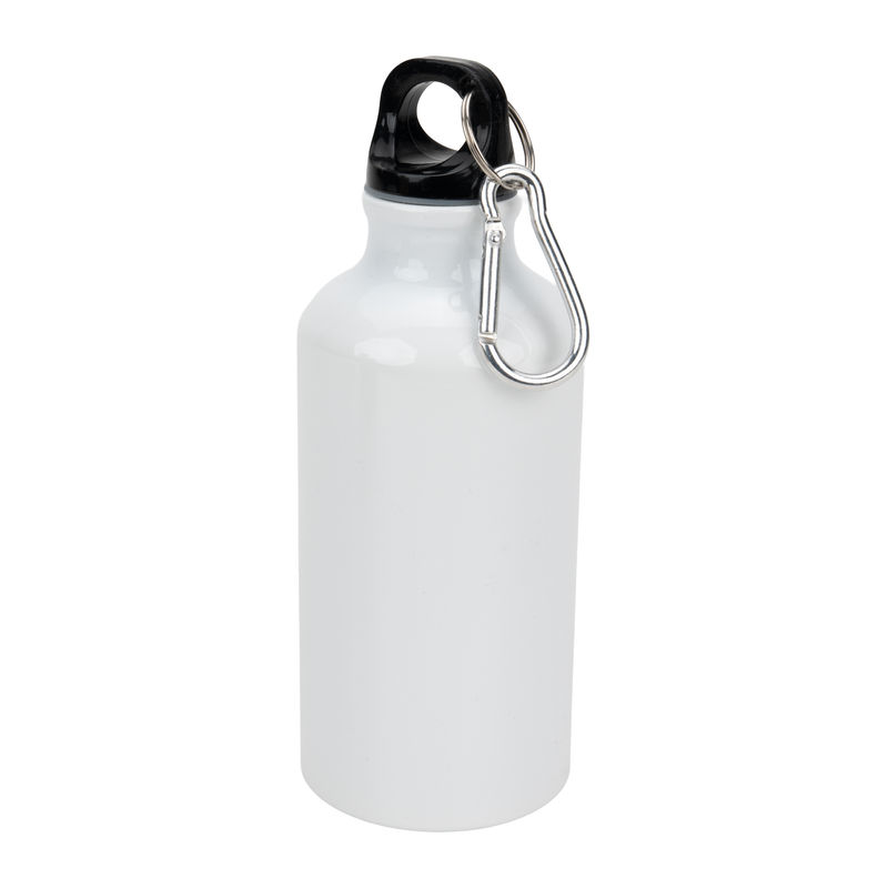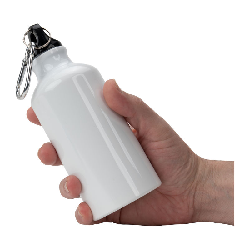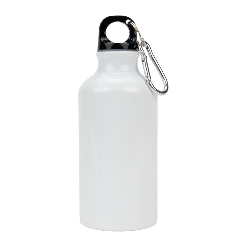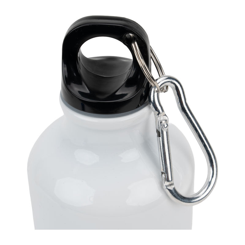 Sublimatie drinkfles van aluminium met karabijnhaak en een inhoud van 400 ml. Wij bevestigen uw reclame rondom de fles met behulp van sublimatiebedrukking.
