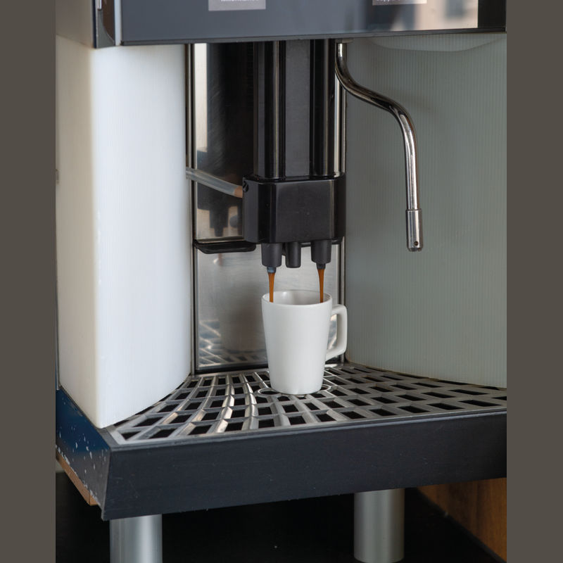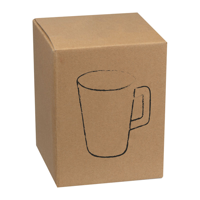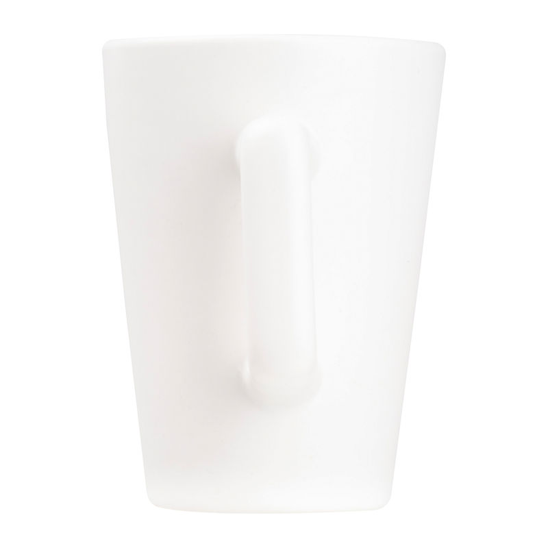 Espressokopje (50 ml) van keramiek met een matwitte afwerking en een hoekig oor voor een modern design. Uw logo wordt met een keramische transfer in het midden op het kopje geplaatst.