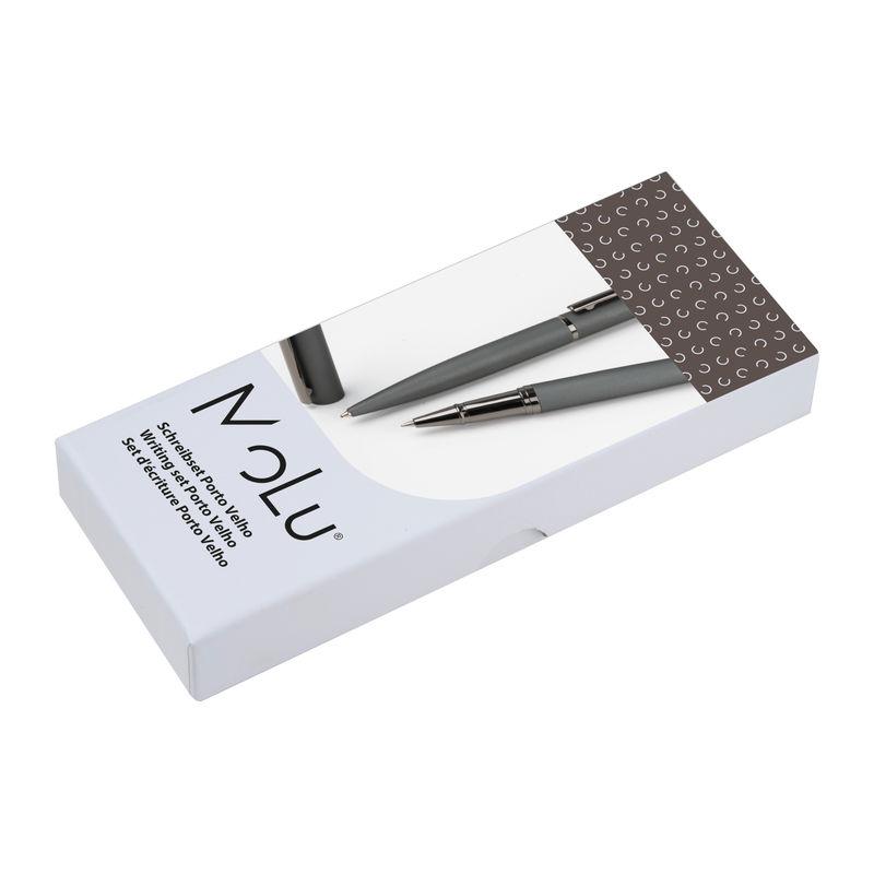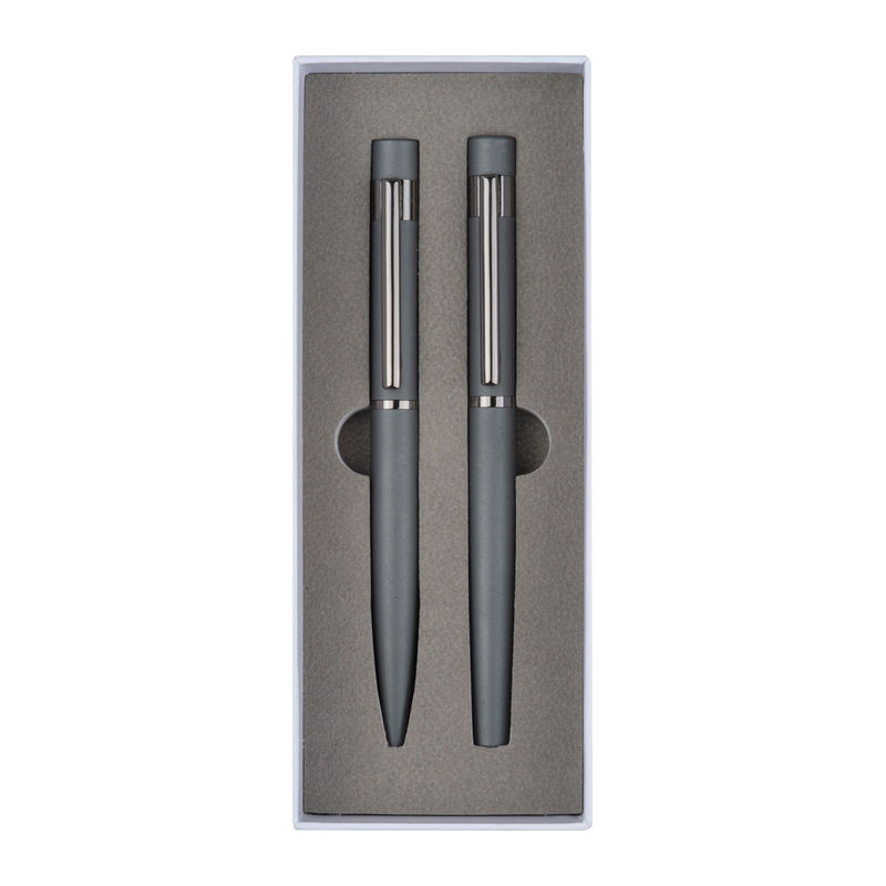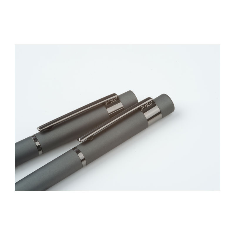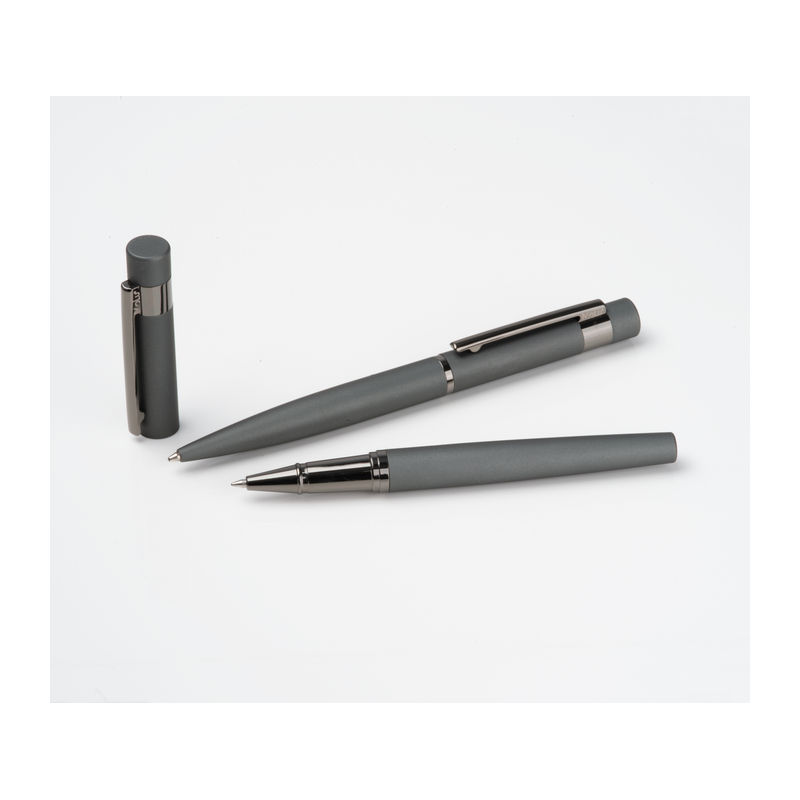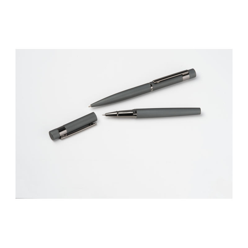 Elegant en comfortabel in één set! Bestaande uit een balpen en een rollerball met blauwschrijvende vulling, voorzien van een rubberen oppervlak voor optimale grip en een stijlvol ontwerp. Ideaal voor dagelijks gebruik of als persoonlijk cadeau: wij graveren uw gewenste tekst op de pen – persoonlijk en van hoge kwaliteit!