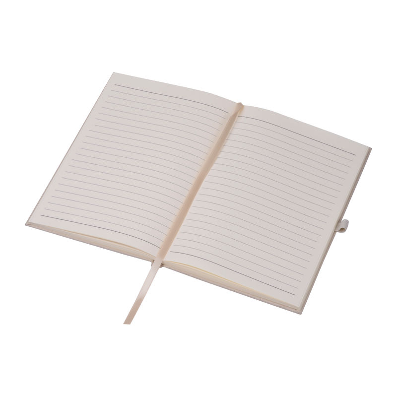 A5 notebook featuring a cover made from coconut shells and 160 lined pages of recycled paper. It includes a bookmark and a pen loop.