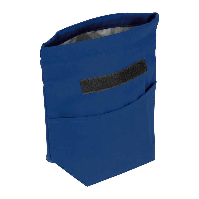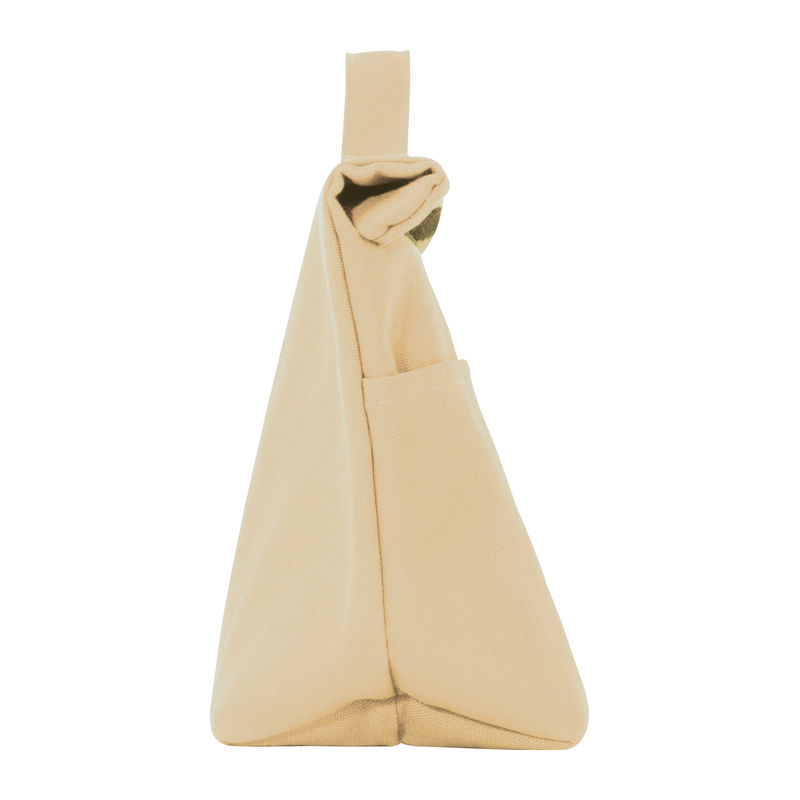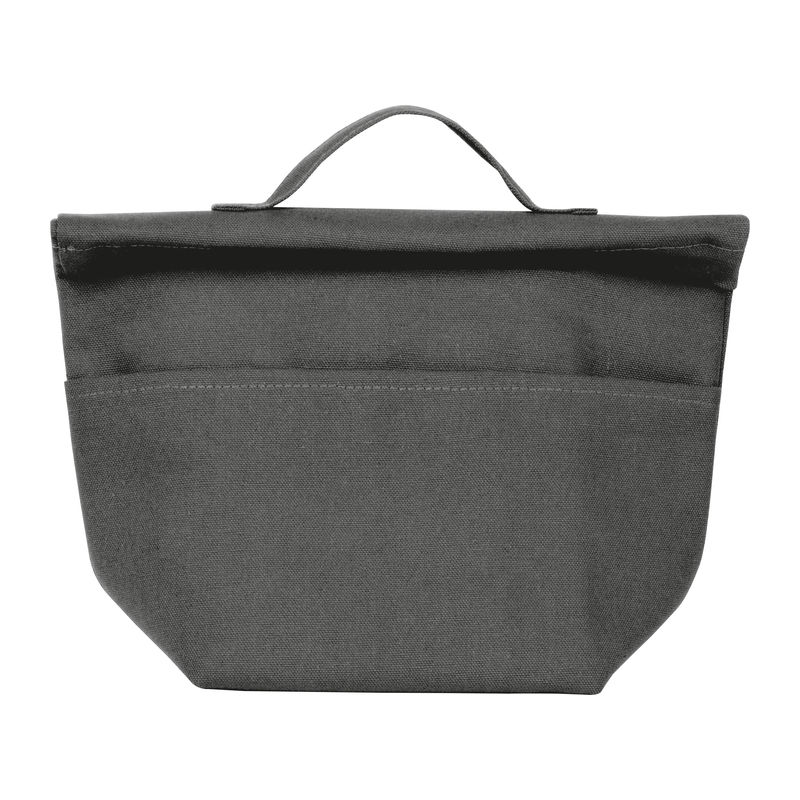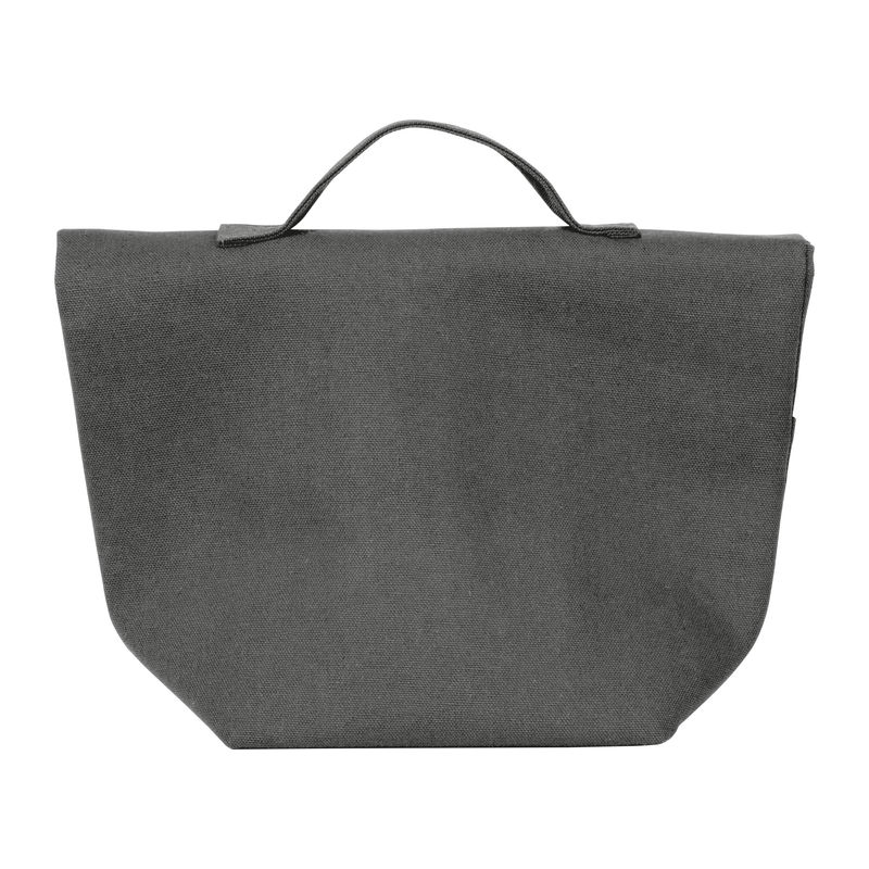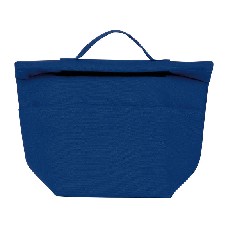 Cooler bag made from recycled cotton and recycled polyester. Features a carrying handle, a wide Velcro closure, and a front pocket.
