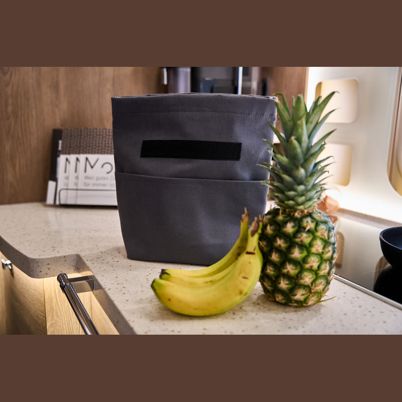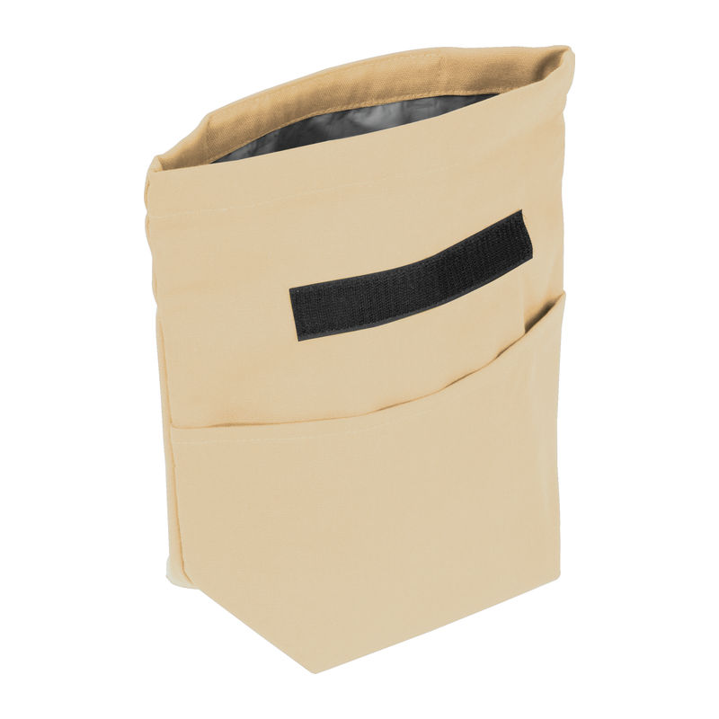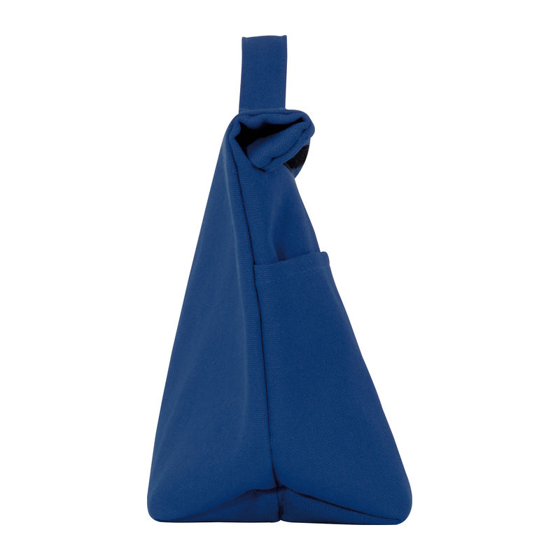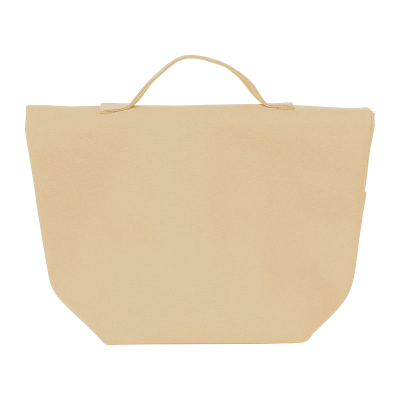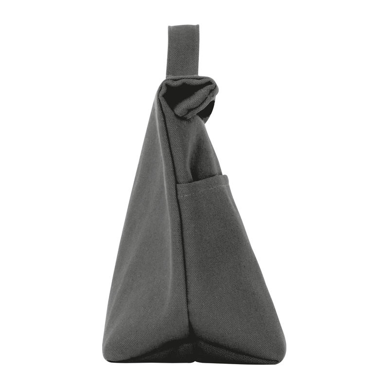Cooler bag made from recycled cotton and recycled polyester. Features a carrying handle, a wide Velcro closure, and a front pocket.