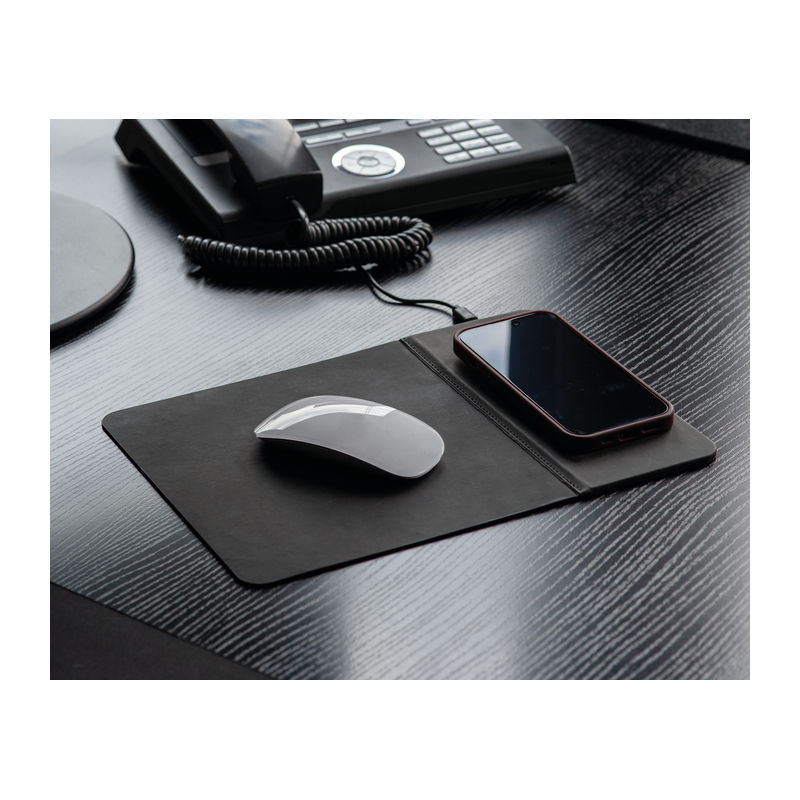 Mouse pad crafted from polyurethane (PU) featuring an integrated wireless charging surface. To utilise the wireless charging function (output 15W) with a compatible smartphone, the mouse pad must be connected to a suitable power source via the included USB-A to USB-C charging cable.