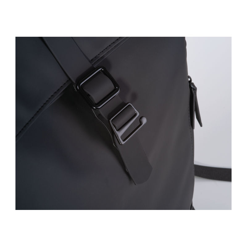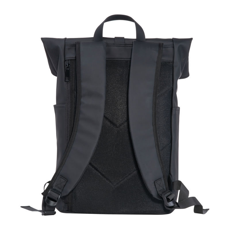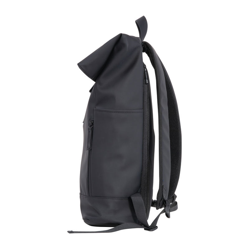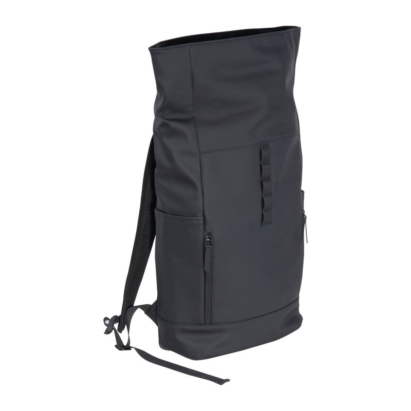 Laptop backpack made of polyurethane (PU) designed for 15-16 inch laptops. Features two zippered compartments on the front, two slip pockets on each side, a large main compartment with mesh and zippered pockets, a padded laptop compartment at the back, padded shoulder straps, a carry handle, and an adjustable main compartment closure.