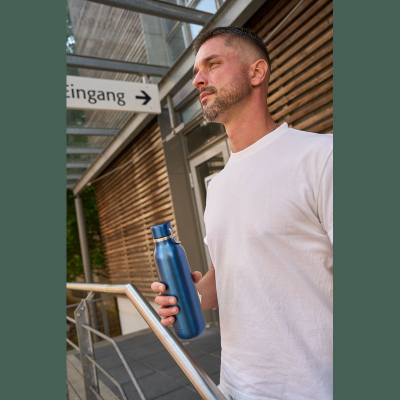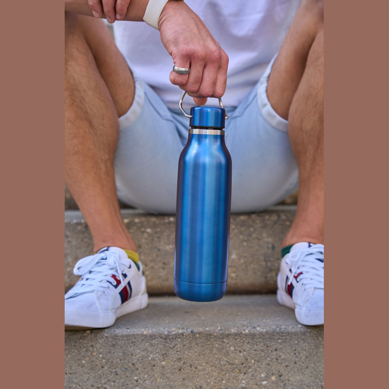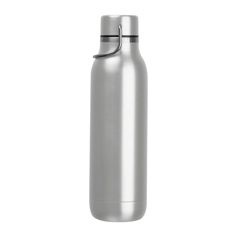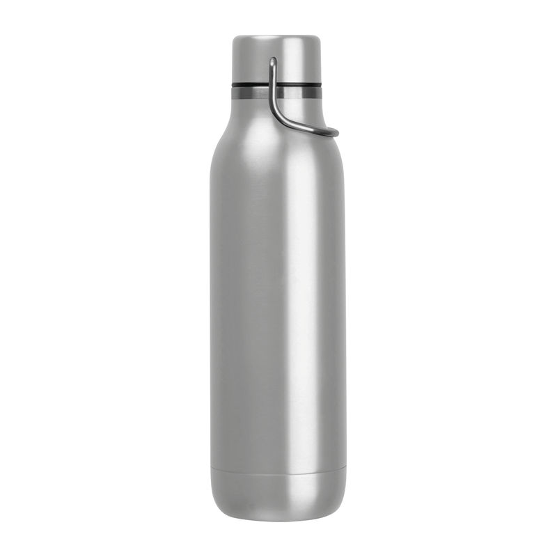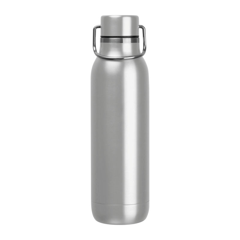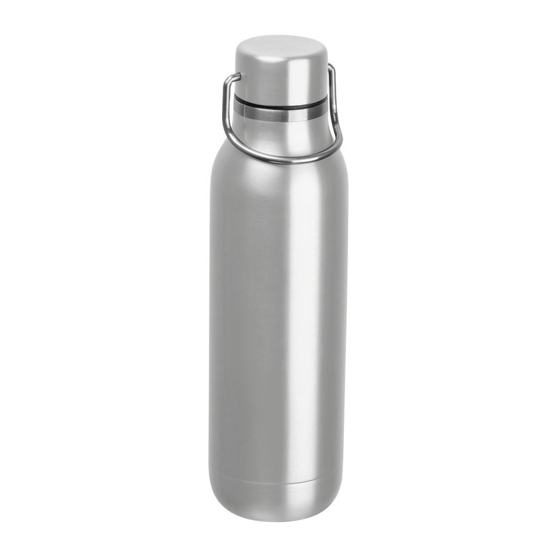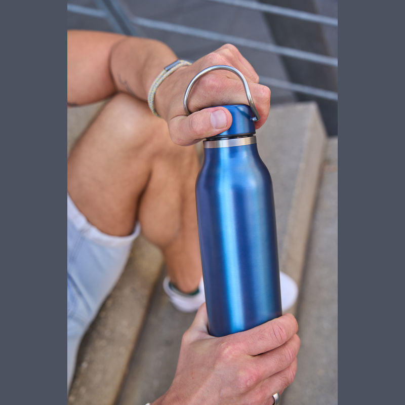 Double-walled stainless steel drinking bottle featuring a carrying handle on the cap and a capacity of 600 ml.