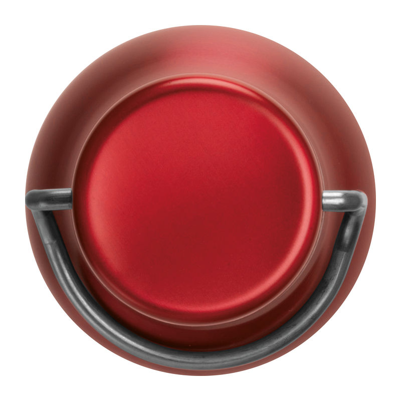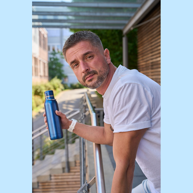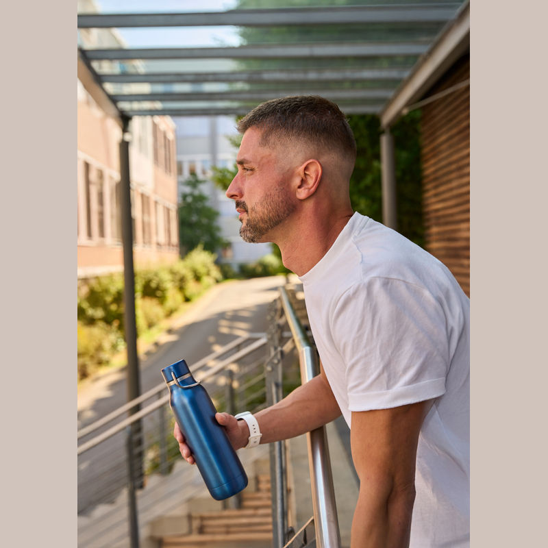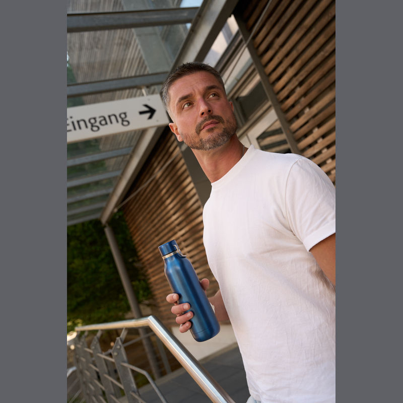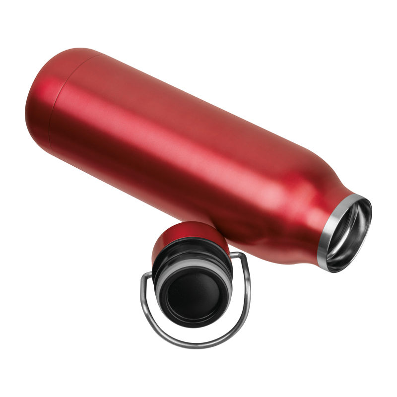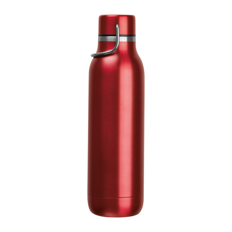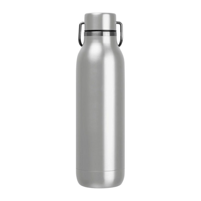Double-walled stainless steel drinking bottle featuring a carrying handle on the cap and a capacity of 600 ml.