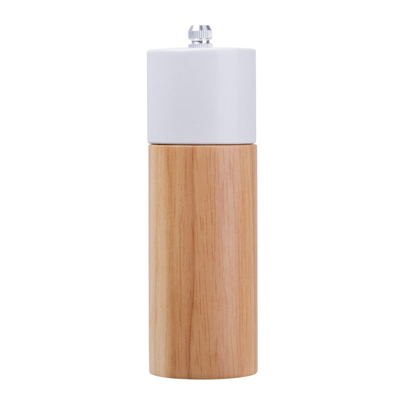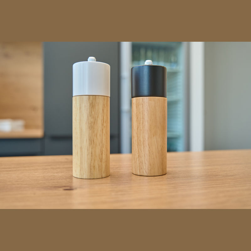 A set of salt and pepper mills crafted from wood, featuring ceramic grinding mechanisms. Each item and engraving is unique due to the natural wood material.