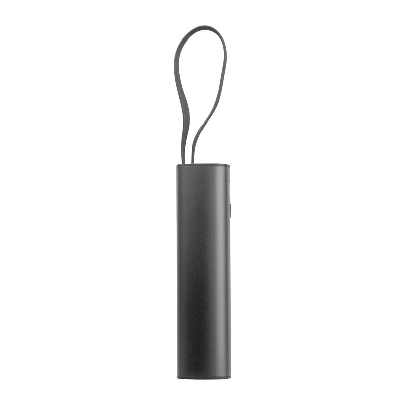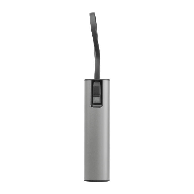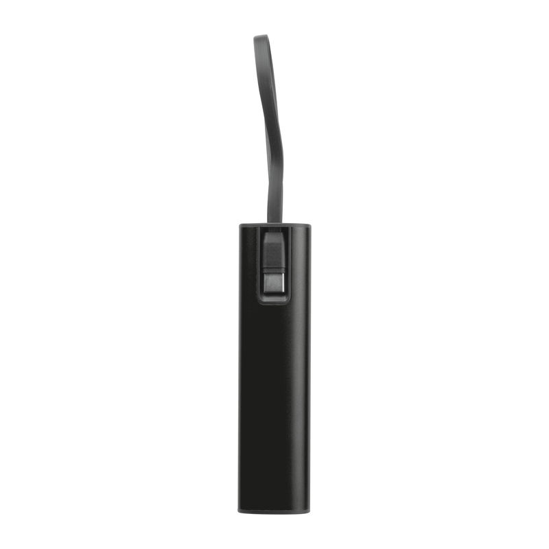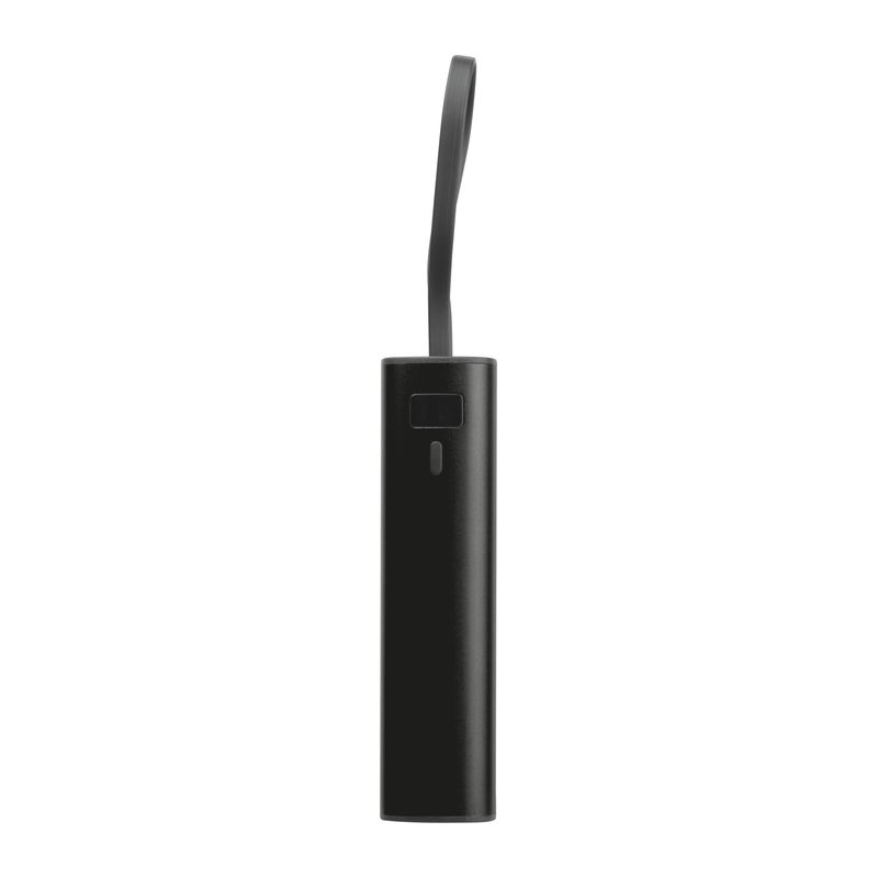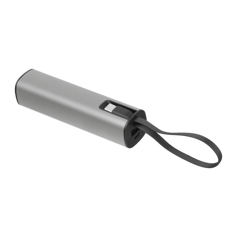 Aluminium power bank featuring a 5,000 mAh lithium-ion battery, a charge level indicator, and an integrated USB-C charging cable. A 30 cm Type A to C charging cable is included.