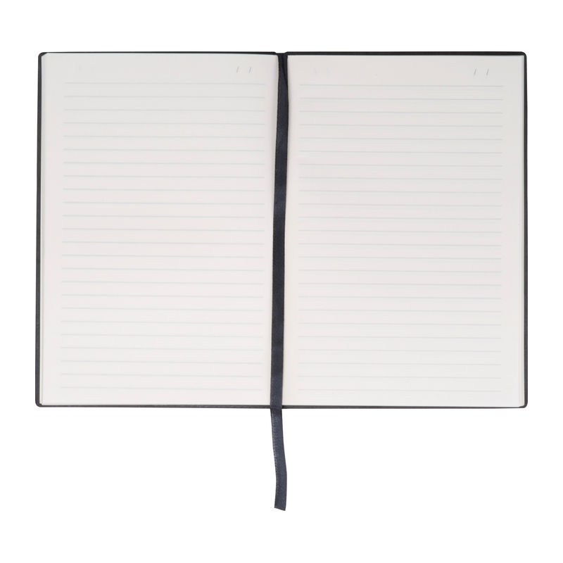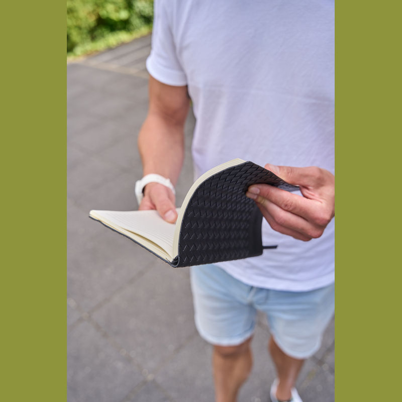 A5 notebook featuring a flexible PU soft cover, a bookmark, and 192 lined pages made from recycled paper.