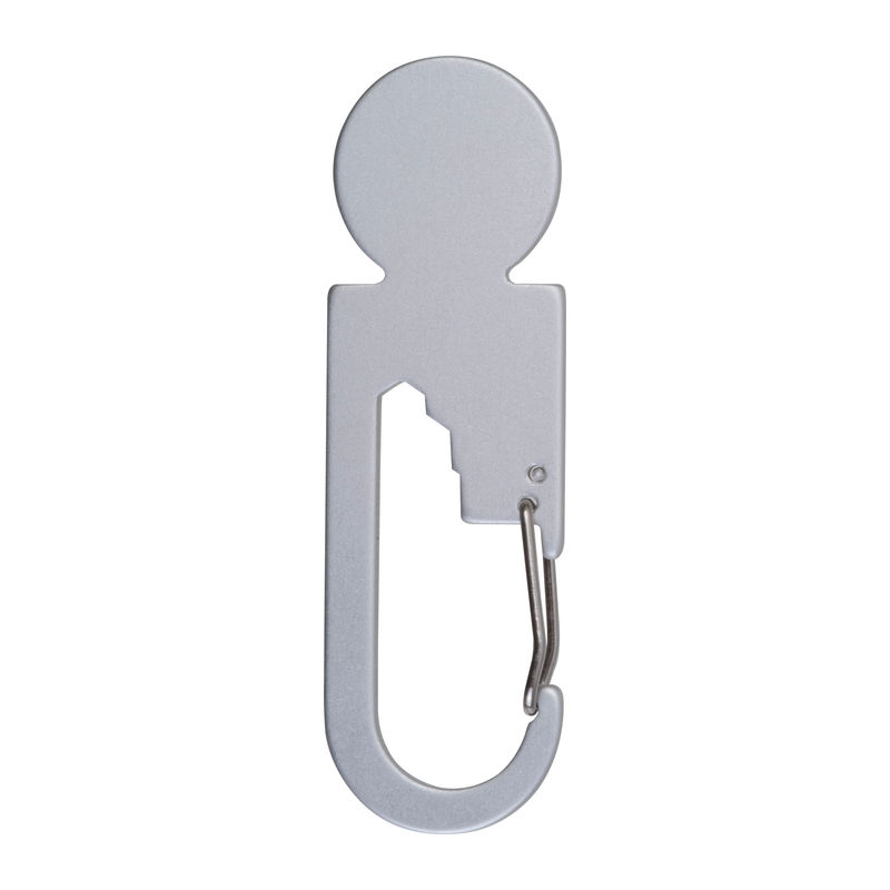 Aluminium multitool featuring a shopping trolley token, three hex keys of varying sizes, and a carabiner.