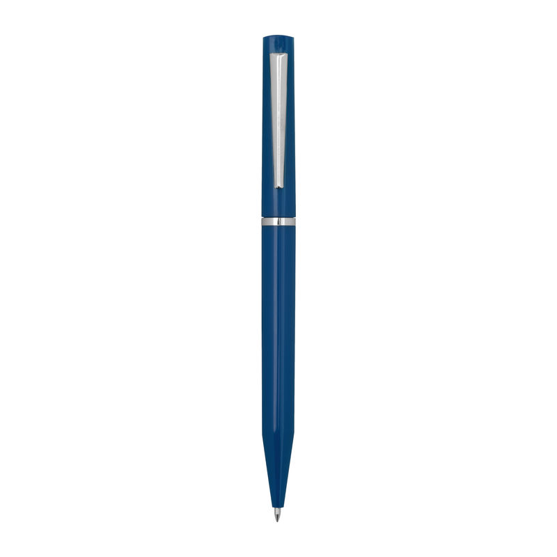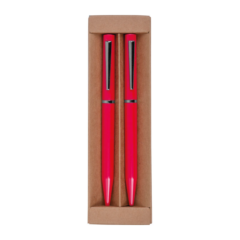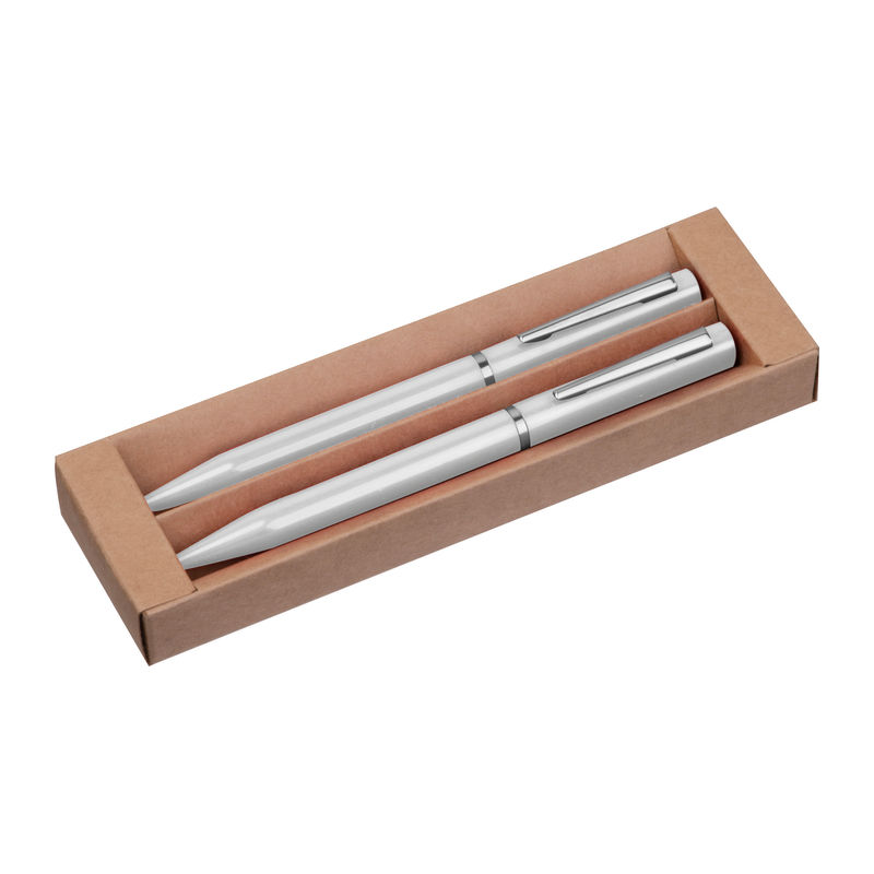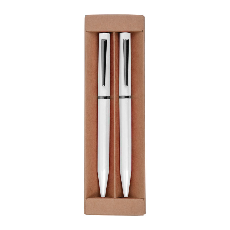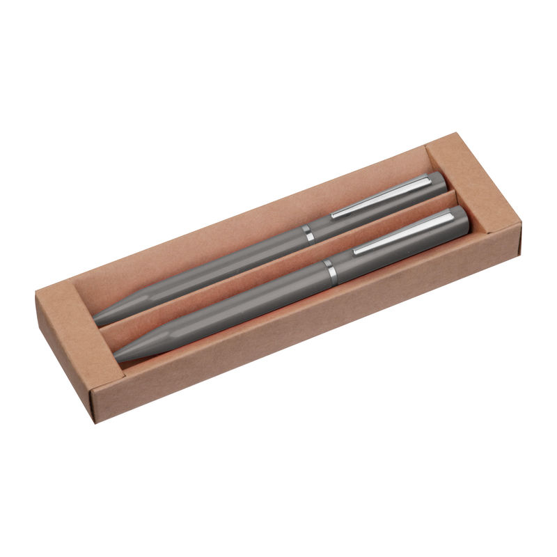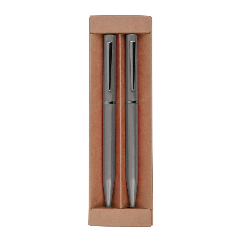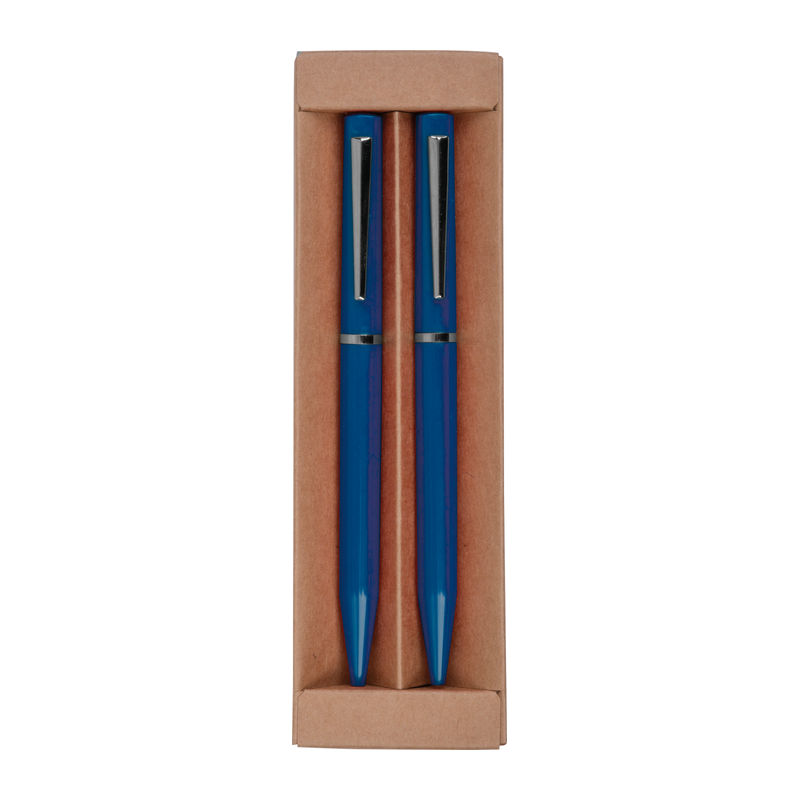 Writing set comprising a blue-ink ballpoint pen and a refill-free mechanical pencil, both featuring a twist mechanism and made from recycled ABS. Presented in a cardboard box.