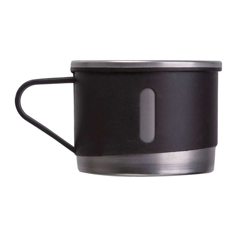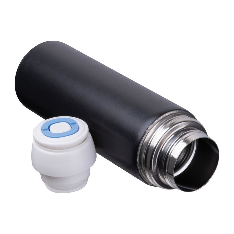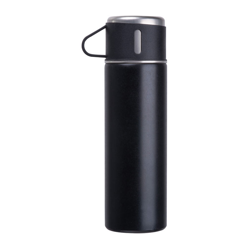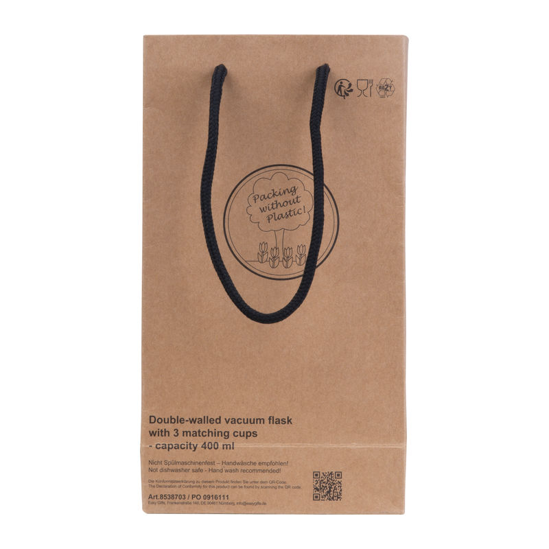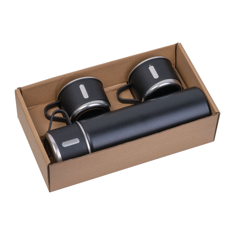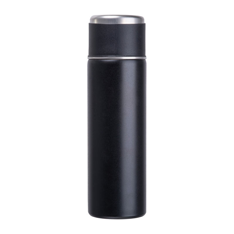 Insulated bottle set comprising a double-walled stainless steel bottle (400 ml) with quick-release cap and three stainless steel drinking cups (120 ml) with plastic coating.