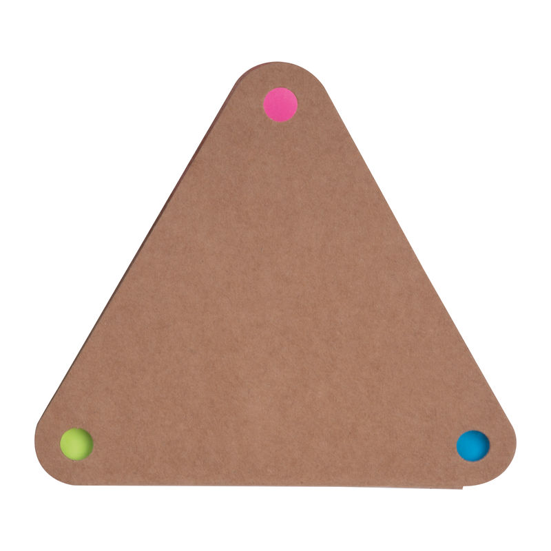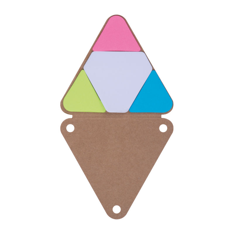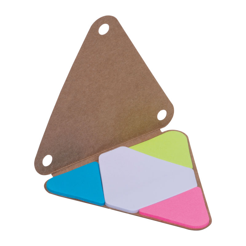 Carnet de notes adhésives en forme de triangle. Le carnet contient 20 grandes notes adhésives blanches et 3 x 20 petites notes adhésives colorées. Votre publicité est imprimée sur la couverture.