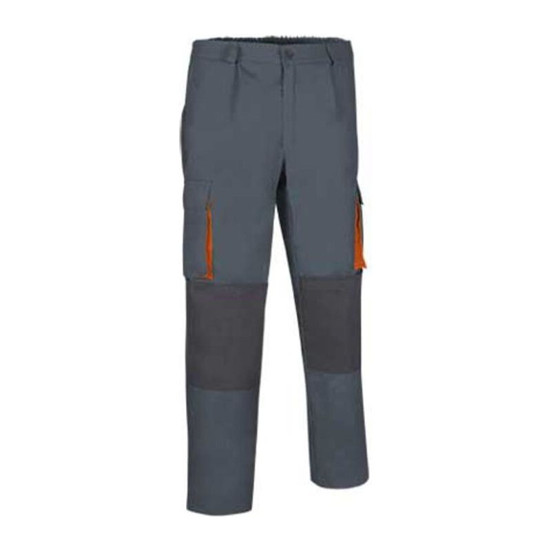 Trousers, 65% polyester, 35% cotton. 220 grs/m² twill fabric. 2 waist pockets. 1 back pocket. 2 lateral gusset flap pockets. Knee pad pockets. Button and zipper closure. 20 units per box: 1 size, 1 color. Individual bag.