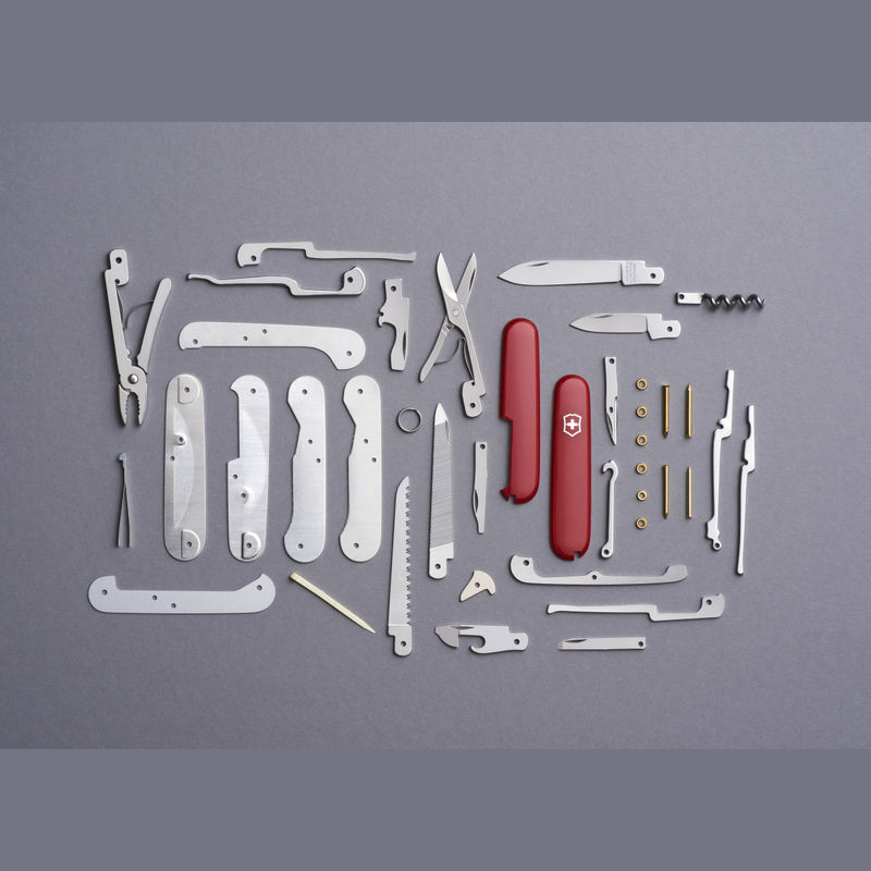 Features: 1.large blade 2.small blade 3.bottle opener with: 4.- flathead screwdriver 5.- wire-bender / wire-stripper 6.can opener with: 7.- small flathead screwdriver 8.multipurpose hook 9.scissors 10.pliers 11.wire cutter 12.wire crimper 13.chisel 14.nail cleaner 15.corkscrew 16.metal saw 17.file 18.large serrated woodsaw 19.reamer with: 20.- sewing eye 21.toothpick 22.tweezers 23.key ring