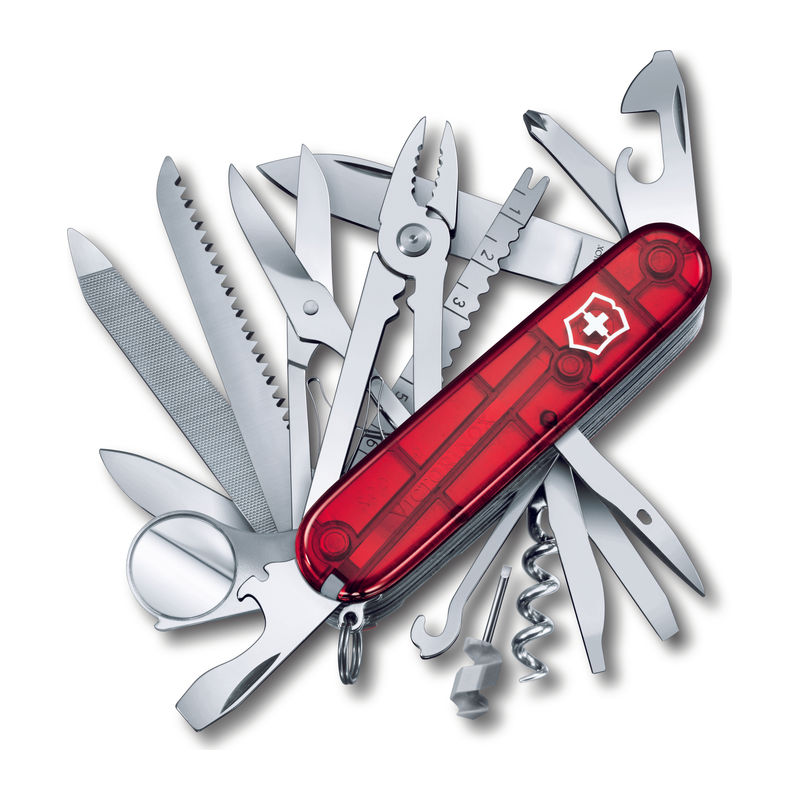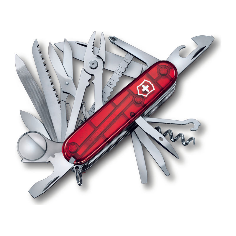 Features: 1. large blade 2. small blade 3. corkscrew 4. can opener with 5. small screwdriver 6. cap lifter with- 7. screwdriver 8. wire stipper 9. reamer 10. key ring 11. tweezers 12. scissors 13. toothpick 14. multi-purpose hook (parcel carrier) 15. wood saw 16. fish scaler with 17. hook disgorger 18. ruler (cm + inches) 19. nailfile with 20. metal file 21. nail cleaner 22. metal saw 23. fine screwdriver 24. chisel/scraper 25. pliers with 26. wire crimping tool 27. wire cutters 28. Phillips screwdriver 29. magnifying glass 30. ballpoint pen 31. pin stainless 32. mini-screwdriver 33. sewing eye