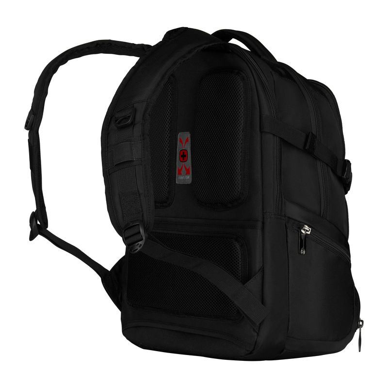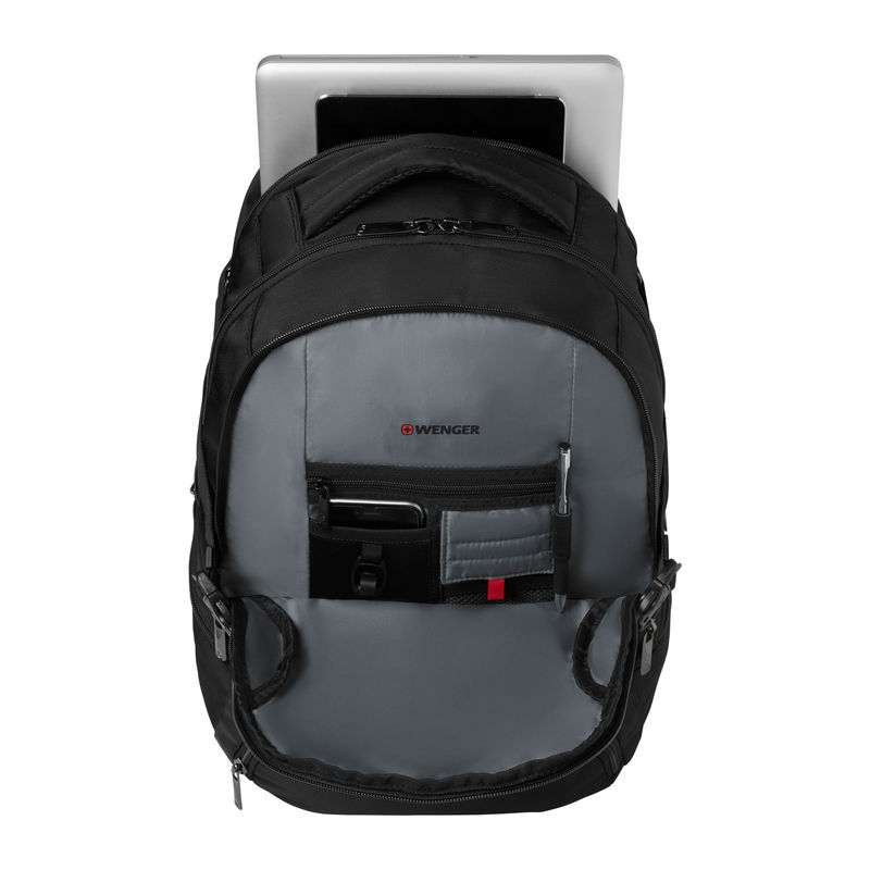 16" deluxe laptop backpack with 10" tablet pocket, stabilizing platform, air-flow back padding, comfort-fit shoulder straps, pass-through trolley strap for easy travel with wheeled luggage and zippered side pocket.
