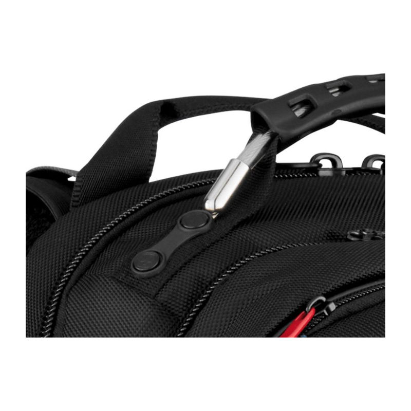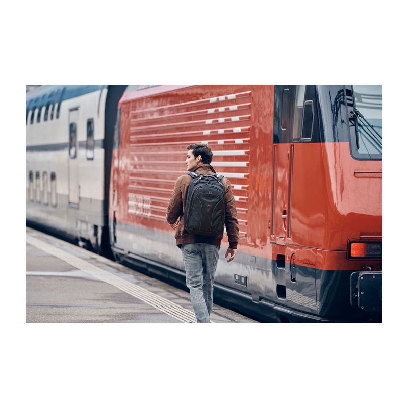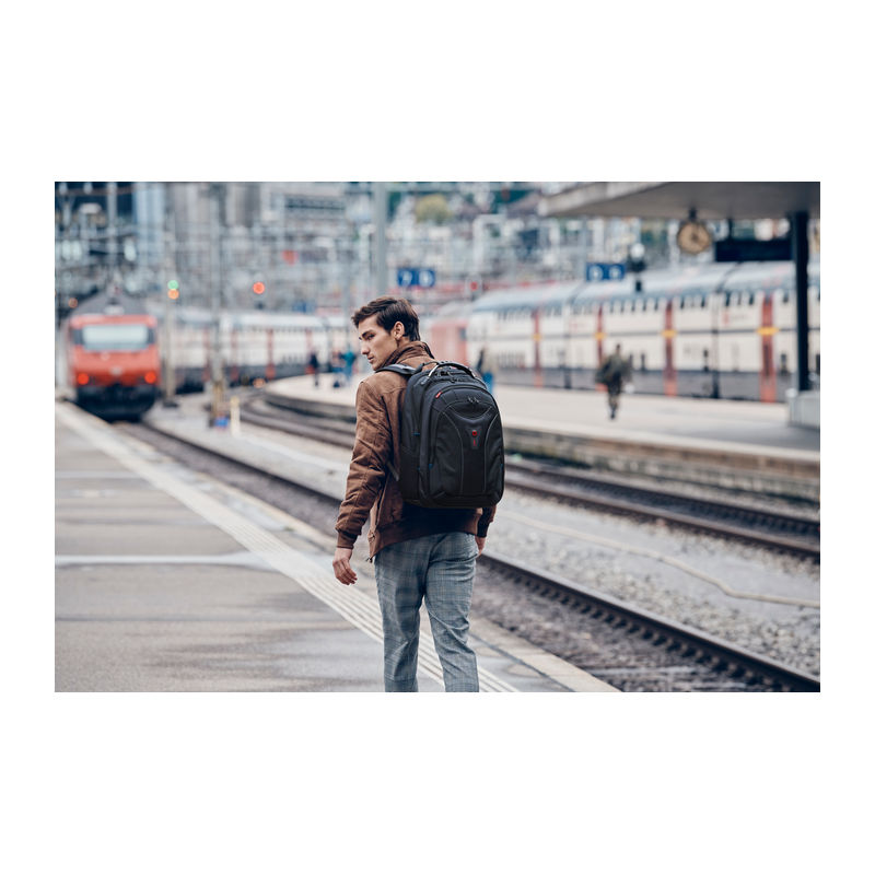 Lightweight laptop backpack for laptops up to 17”, with stabilizing platform, airflow back padding, amortizing shoulder straps, ergonomic handle, quick access pocket, mesh side pockets and pass-thru for mounting the backpack on the suitcase handle.