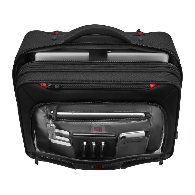 Perfect for the on-the-go commuter, this expandable rolling business case allows you to carry a laptop, tablet, documents and more with ease, Padded compartments protect up to a 16" / 41 cm laptop and an iPad, 10" / 25 cm tablet or eReader, Expands 2